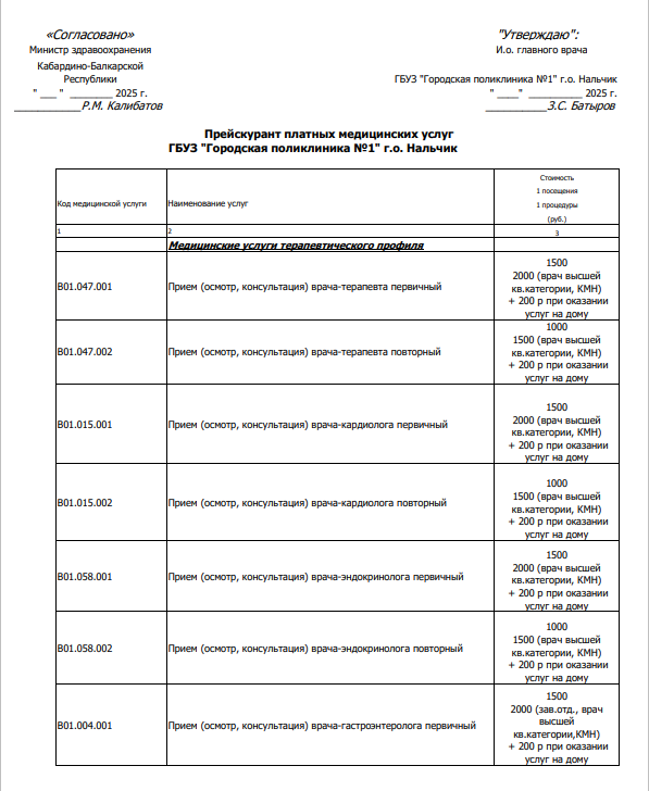 Платные медицинские услуги оказываются работникам организаций в рамках заключенных договоров или самостоятельно обратившимся гражданам с предварительным оформлением договора на оказание платных медицинских услуг по перечню, согласованному с Министерством здравоохранения КБР.